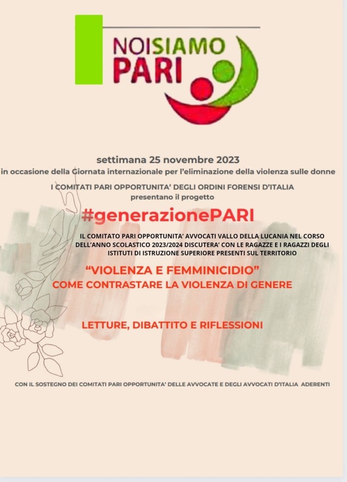 In occasione del 25 novembre il Comitato Pari Opportunità dell'Ordine degli Avvocati di Vallo della Lucania comunica la sua adesione al progetto #generazionePARI proposto dal Gruppo di lavoro dei CPO degli Ordini Forensi Nazionali "Progetto Scuola" con l'obiettivo di creare un canale di comunicazione diretto con le ragazze e i ragazzi delle Scuole Superiori, finalizzato all'informazione, alla prevenzione, all'ascolto.
