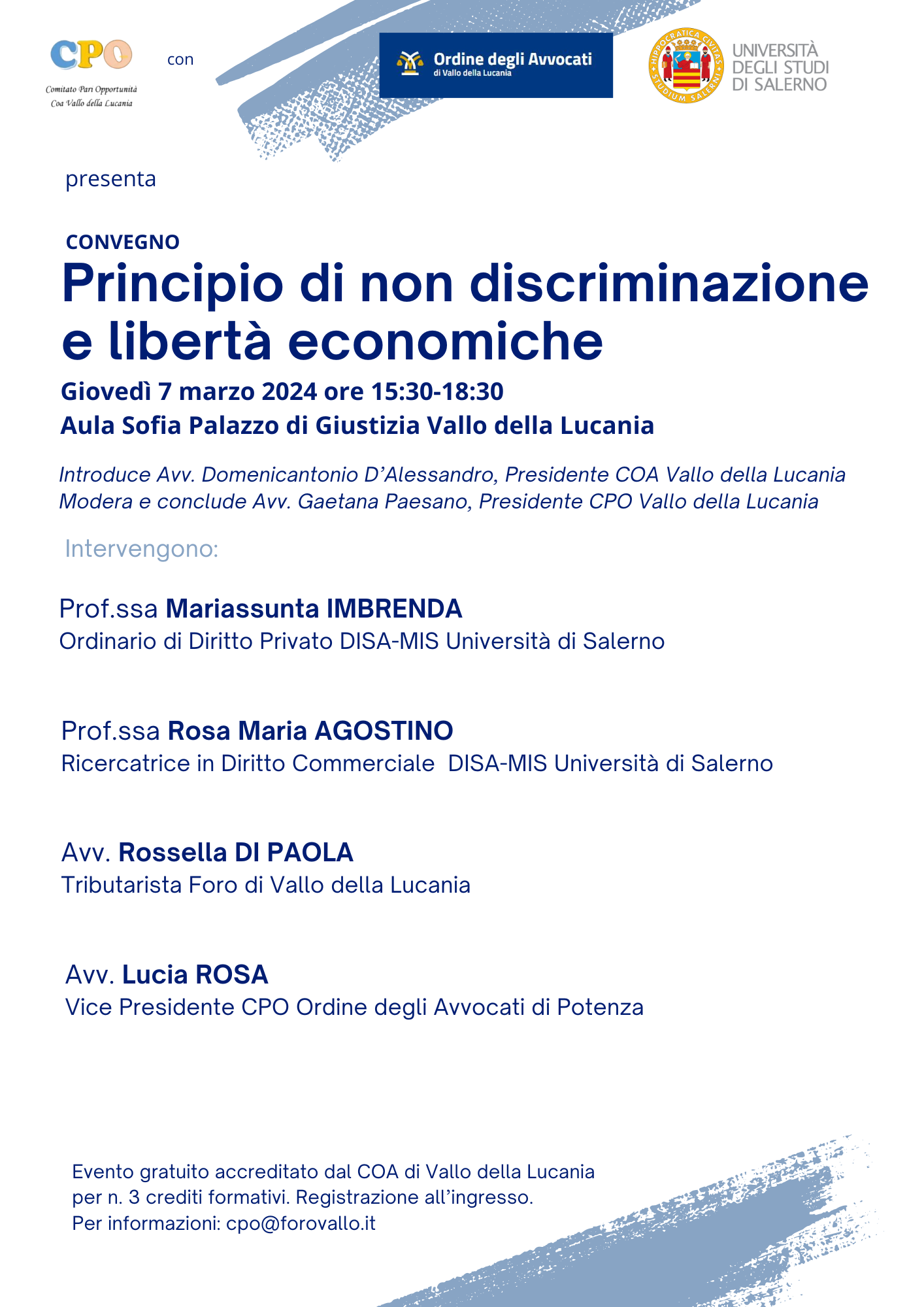 Principio di non discriminazione e libertà economiche. Convegno del CPO a Vallo della Lucania.